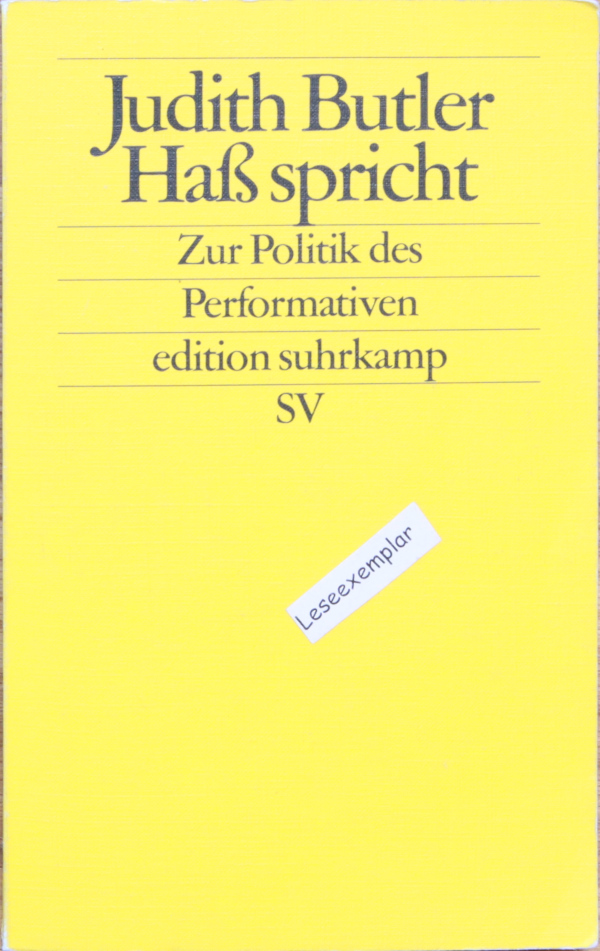| 126 | Haß spricht: Zur Politik des Performativen![]() | Butler, Judith Suhrkamp Verlag | 978 3 51812 414 7 | 8,92 € |